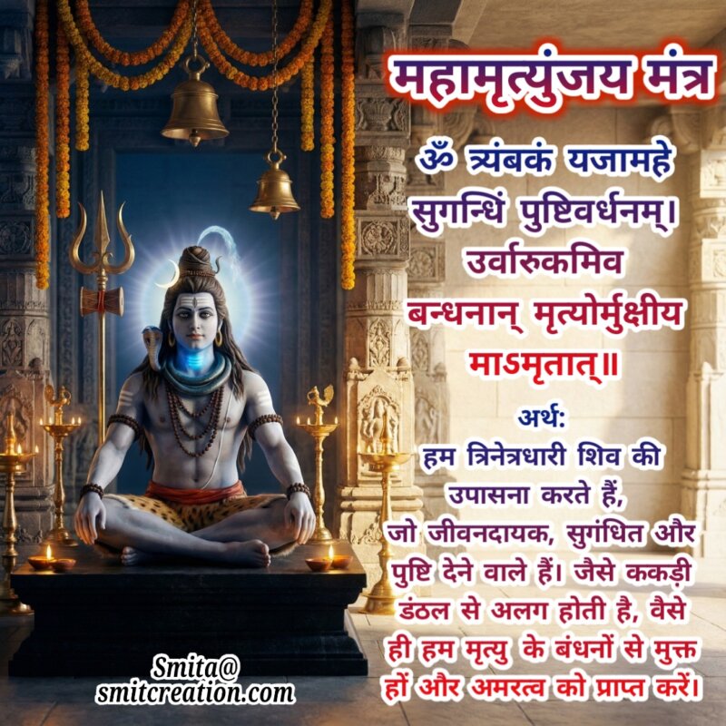 हम त्रिनेत्रधारी शिव की उपासना करते हैं, जो जीवनदायक, सुगंधित और पुष्टि देने वाले हैं। जैसे ककड़ी डंठल से अलग होती है, वैसे ही हम मृत्यु के बंधनों से मुक्त हों और अमरत्व को प्राप्त करें।